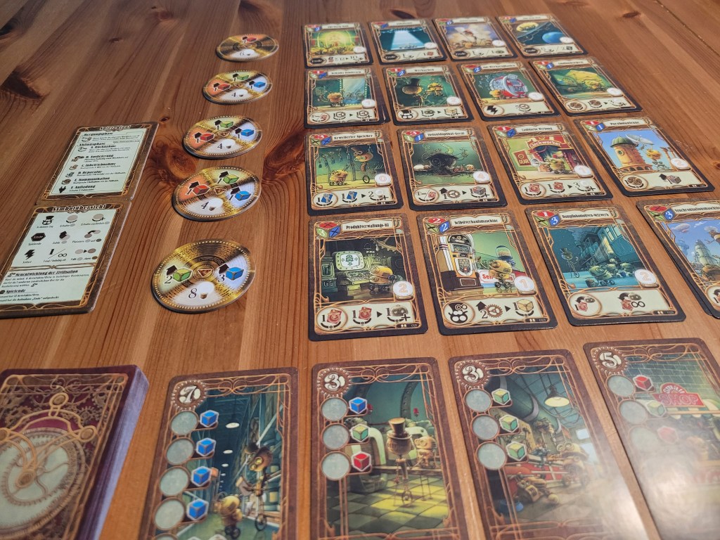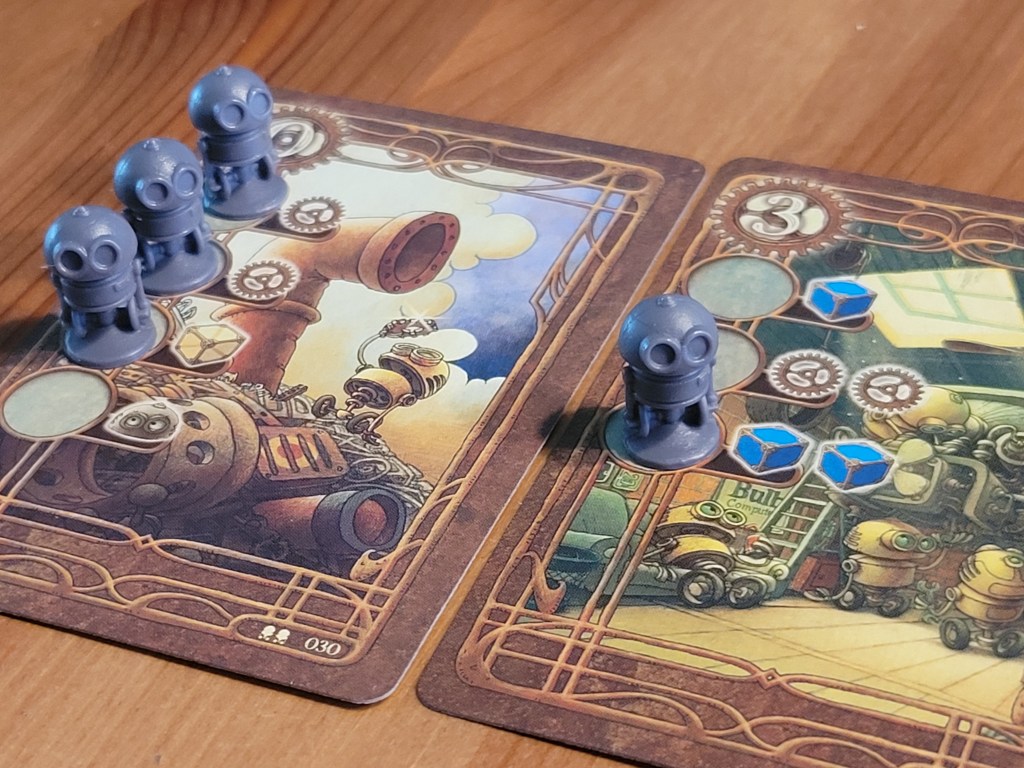 Clockworker is a pleasant board game in which we use little plastic robot miniatures to produce resources and spend those to acquire skills, buy victory points, or open up new opportunities to produce more resources. Among experienced gamers, you might think of this as a “worker placement” game, and that’s not too far off. Clockworker is perhaps more closely related to Machi Koro than to Agricola. Instead of a board, there is only a card display from which you can buy cards and place them in your own playing area. The miniatures, which really live up to the word “mini”, are taken from those cards to be put into your own supply together with a resource depicted on the card. Instead of the often (and unjustly) criticized dice in Machi Koro, we fill and empty our cards quite deterministically over the course of the game. As a result, instead of the thrill of gambling, play focuses is on the challenge of efficiently planning your turns.
