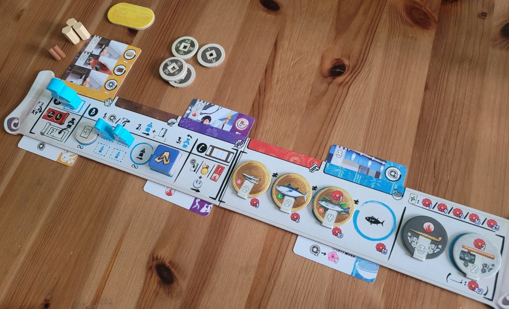 This way Iki manages the small but impressive feat of incorporating the dynamics of a trading game without relying on haggling or unfair deals. We purchase cards and offer them on the board, in the hopes of others using them and securing an ongoing advantage for us.