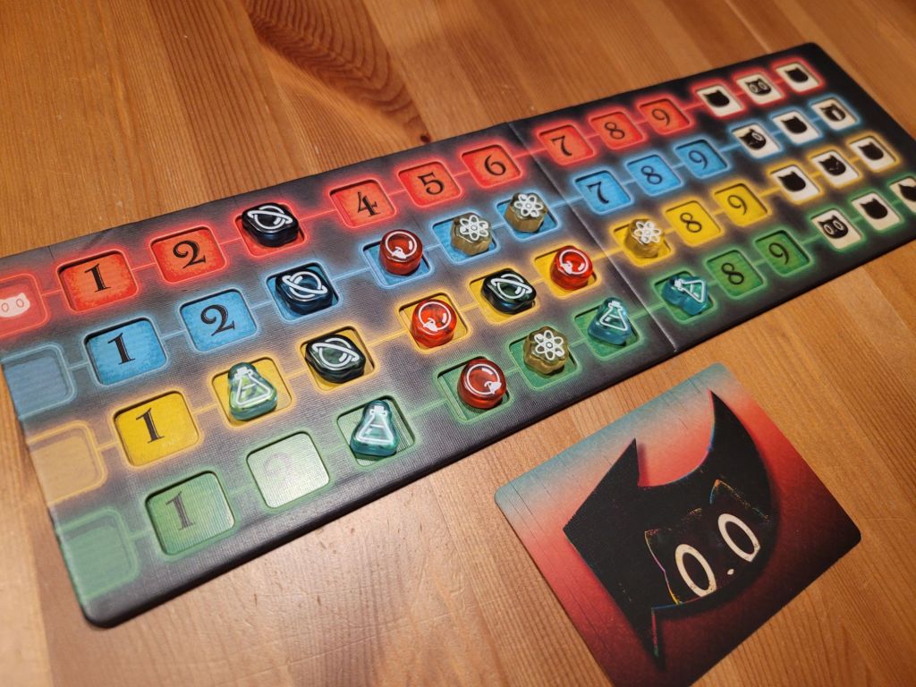 But there are two clever additions, that make Cat in the Box stand out. The one I consider more impactful, might seem trite to others. Every card played into a trick is recorded on a common board. Once you play a card, you place one of your player tokens in the appropriate intersection of color row and number column. This lets all players know, that that card is no longer in the game. In turn the logic puzzle at the heart of all trick-taking games becomes apparent to all. Which of my cards can still win a trick, and which cards are effectively useless? The game board provides a gradually filled grid, that invites you to logically deduce the strength of your card hand. These are the questions and considerations you need to identify in such a game, in order to even begin to play purposefully. More than that, it’s these mental models you need to to practice and train, in order to get better at these games.