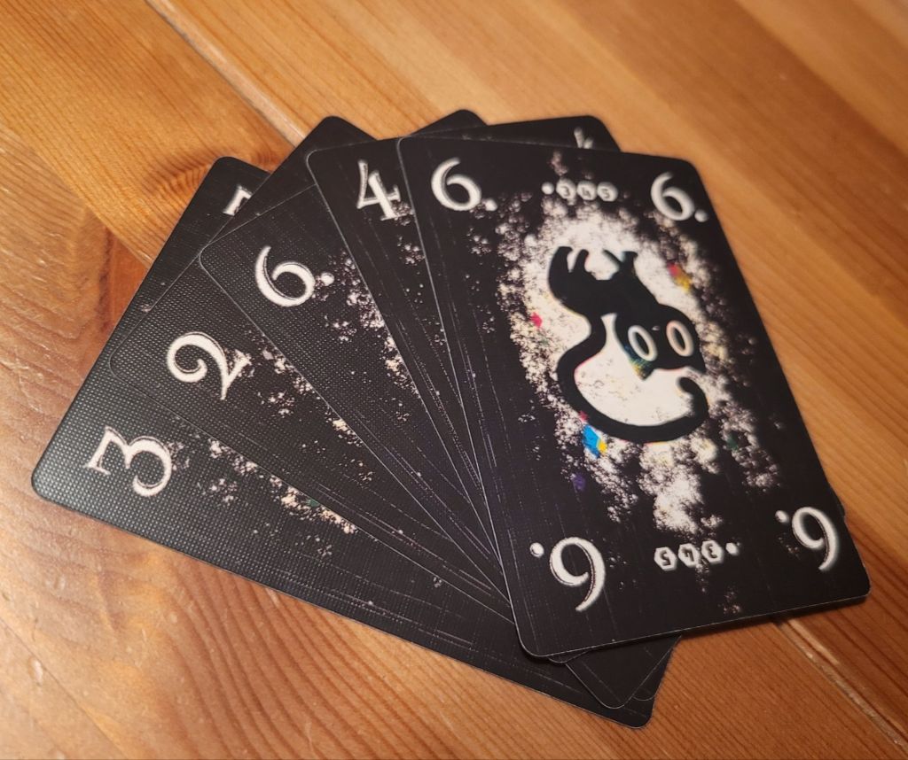 But Cat in the Box is also a very challenging trick-taking game. Beyond the basic skills of a trick-taking game, you train here, there are additional levels, that invite players into the depths of tactics, subterfuge and strategies. This is due to the second trick (hah!) that Cat in the Box has up its sleeve. It’s the one that is more flashy, ironically, and the reason why the game is called Cat in the Box to begin with. Because while the cards have numbers printed on them, they do not have a suit printed on them. That you get to determine, when you play the card. The resulting flexibility (or unpredictability) leaves experienced trick-taking players with a lot less certainty in planning their turns. You need to anticipate a ludicrously large number of potential plays by your opponent. It’s only after the first few tricks have been played, that things begin to take shape and you can start to evaluate which tricks you may still be able to get.