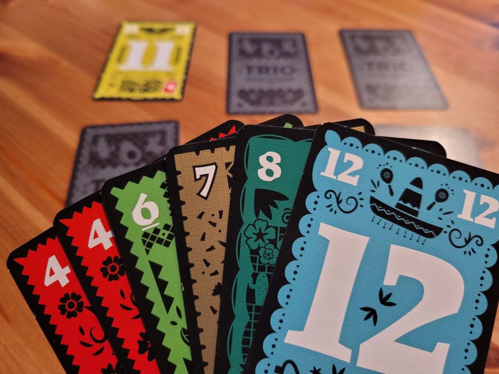 This makes Trio a refreshing and unusual mix of deduction and memory game, with a pinch of bluffing. Most of all this leads to a recurring back and forth between moments of hilarity and tension. It’s regular bursts of excitement, when you’ve identified a pair of cards and know that the third one is the lowest in your own hand, all while hoping that that nobody else will call on you to reveal a card. Or it’s the small moments when you have to consider, if you want to turn over a face down card instead of asking somebody, in hopes of finding that missing third.