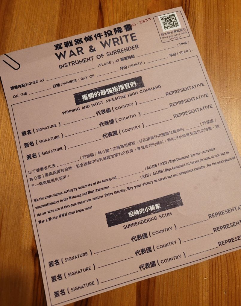 It features a pre-printed form titled “instrument of surrender” for all participating players. At the end of the game all players can write down their names and sign it as representatives of the country they played as. The winning team is named “most awesome high command”, while the defeated team has to sign under “surrendering scum”. Even within said document, there is reference to the next game of War & Write II. All of this is purely part of theater. It’s diving deep into the fiction of the game by using the means the game has provided us with. It could not be more evident that play is not about engaging real world history, or experiencing a perspective that is rooted in actual history. More than that, even within the surrender agreement the defeated players promise revenge next time. Even within the fiction, within theater, the game rejects any claim of representational value and instead refers back to the players playing a game in the real world.