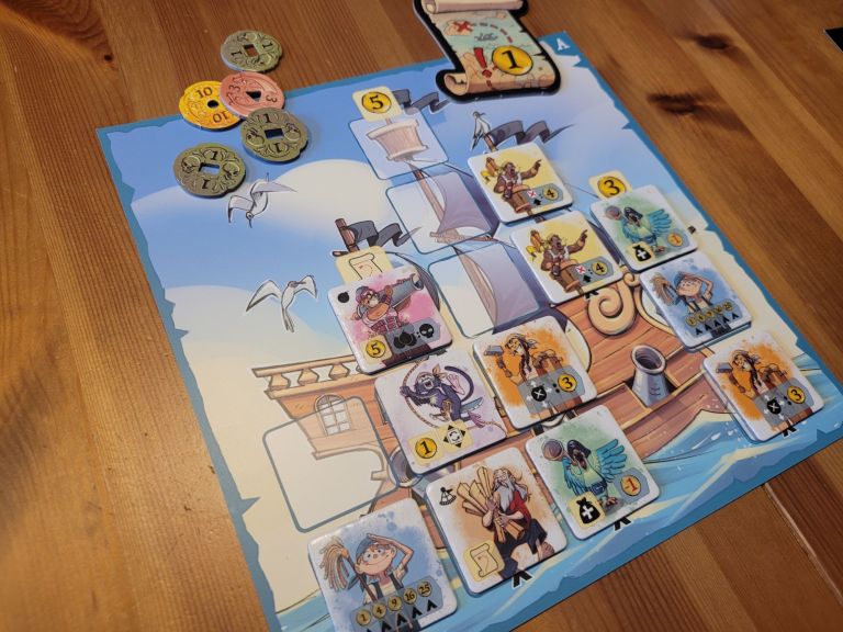 If you fully subscribe to the majority opinion, you’re unlikely to embrace Captain Flip. We make few decisions here. In fact, it’s just two per turn. The first has to do with whether we flip over the tile we just drew from the bag. Each side of the tile features a member of a pirate crew. Each such member scores points in some way. Some do so right away. Others only if certain conditions are met. Yet others only score points at the end of the game. The decision is further complicated, since we only know one side of the tile. Only by turning it over do we discover the alternative crew member, but also commit ourselves to keep them on board.