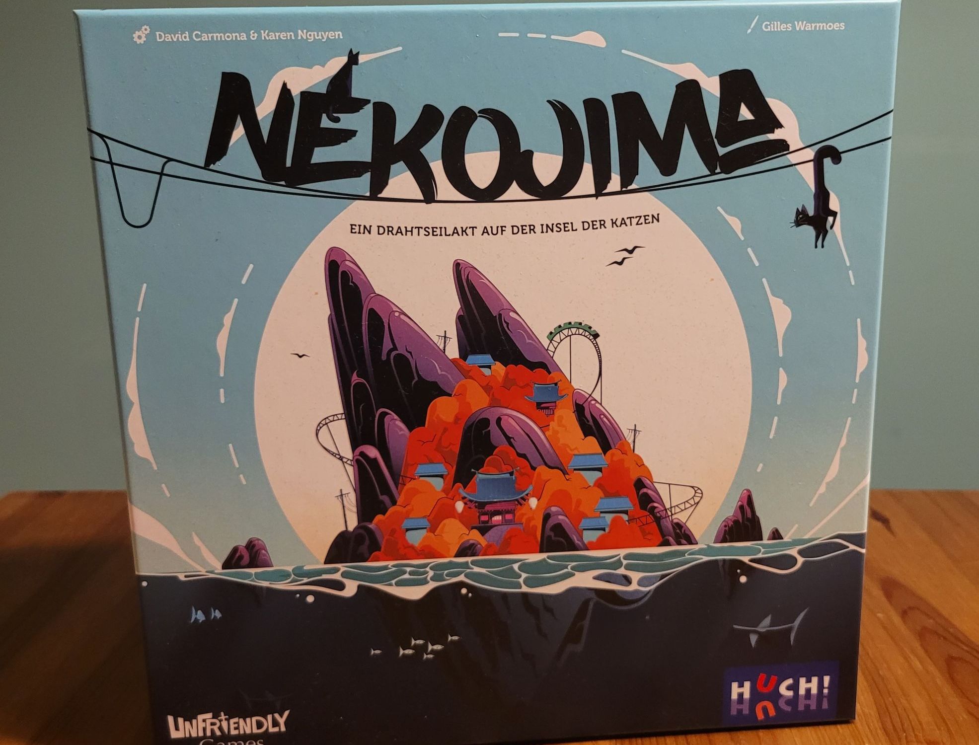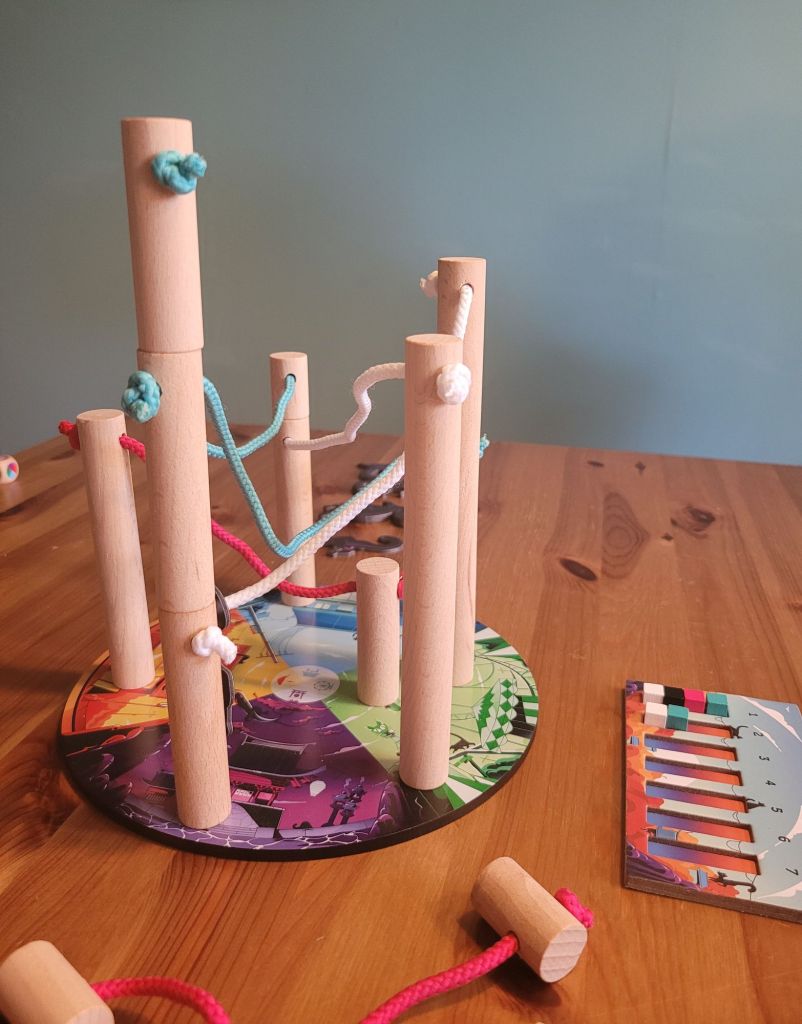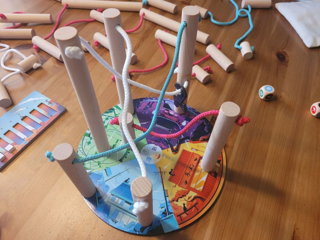 It’s this nervousness and tension, that makes Nekojima fun. The components are not a means to an end. In a dexterity game everything hinges on the quality of those components. It’s not about whether the material used is particularly upscale or looks costly. What matters is that the characteristics of the components are in line with the design’s goals. This is where the publisher and/or authors apparently struck gold. The low weight of the wooden poles makes it difficult to tell, if stacking them on top of each other will succeed; whether the poles’ center of mass might have been a fraction of a millimetre to the left. How much of an impact weight has on how the game plays, becomes apparent when you compare the wooden poles to the black cardboard cats, which you have to hang onto the ropes during the game. The unexpected weight of those punch-out tokens makes it even more difficult to gauge, if the stacked wooden poles will stay upright or not.
