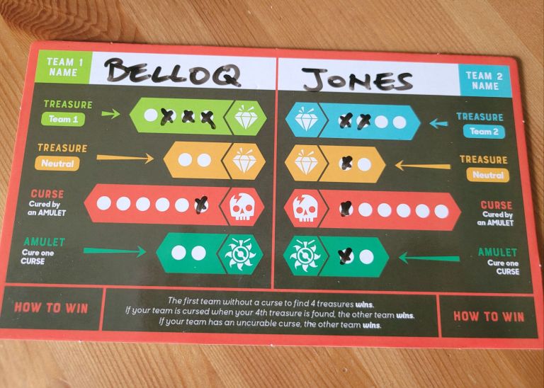 The cooperative variant of Landmarks – much like Precognition – is the advanced level of the game. For inexperienced gamers, the significantly simpler competitive version works as a decent tutorial. Two teams – each with their own guide – compete to get to four treasures first. The island board (or cloth map) is shared by both, so each word placed, offers new options to the other team but also new words to associate with their given tile with.