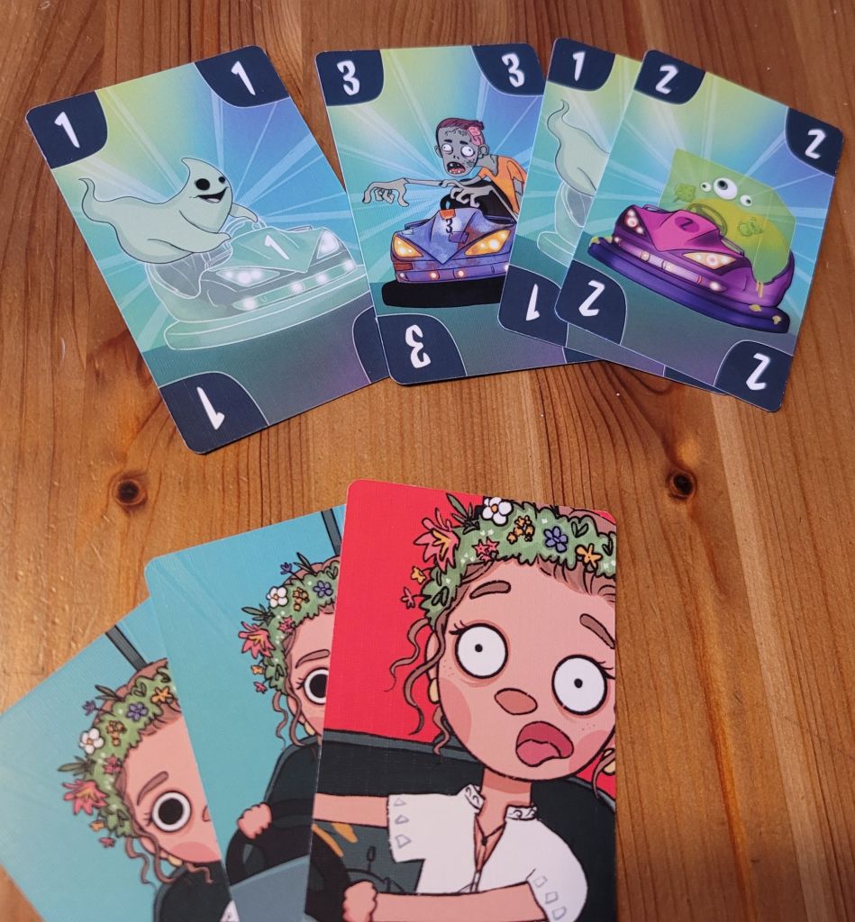 It’s about the loud, often intrusive ramming and bumping into each other, while seated in dinky, electrical wagon while noisy pop songs of yesteryear blare from tinny loudspeakers all while slightly drunk teens are laughing over who rammed whom. In other words, it is silly and chaotic. It follows some basic rules and is over so quickly, you might as well have another go. It doesn’t hurt, and even if it does, this only lasts until you’ve managed to throw somebody else off, and the schadenfreude threatens to overcome the entire table. It is rare that the a trick-taking game’s theme is so neatly expresses what playing it feels like. Ghostbumpers is impressively close to being Bumper Cars – The Trick-Taking Game.