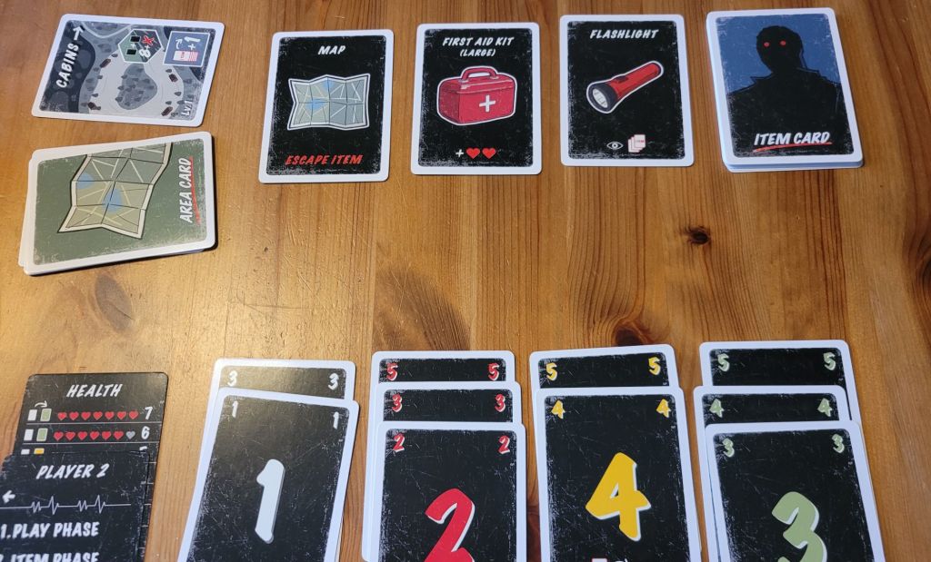 So far, so mechanical. But its inclusion of thematic references and the carefully curated visual style of the game manages to kick off players’ imagination. Designer and artist K. Takahashi eschews extensive details or long-winded narration to create The Slasher’s atmosphere. The places we flee to from round to round to avoid the killer are established in simple top view and given generic names: Fire Pit, Woodlands, Lodge, etc. That’s all it takes. If you’re passingly familiar with the slasher genre, you immediately recognize its archetypical elements and can vividly imagine them as you play. After each round we go through the deck of item cards, looking for objects that will help us survive or for items we need to escape the killer and win the game.