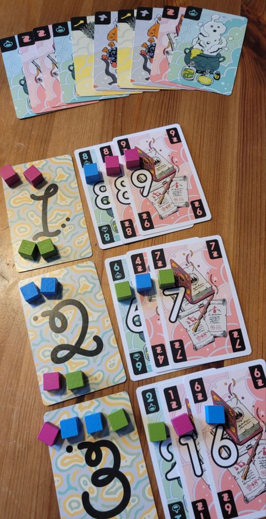 Whereas Ghostbumpers is very transparent about its chaos and unpredictability, Seven Prophecies suggests a little more control and influence. After all, each round begins by determining the suits the next 10 tricks will have to follow. Here, the traditional categories of suits and value of 1-10 is alive and well. What’s less traditional, is that instead of announcing how many tricks you will win; you will have to announce how well you will score in each trick. Which is to say, will you play the strongest, second-strongest, third-strongest or weakest card into the trick? As clairvoyant witches this should be a walk in the park. Surprises aren’t rarer in this game, but the often carry through to later tricks as well.
