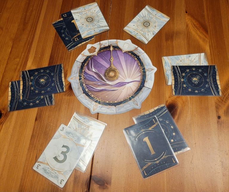 Take Time also has a few challenges up its sleeves, that will likely test a gaming group’s skills. Yet, the game’s core idea is surprisingly quick to explain and easy to grasp. In turn order we play cards face down around a circular game board (called “clock”). At the end of a round, these cards need to fulfil certain conditions, in order for us to win. During card play, we’re not allowed to talk to each other, so we have to carefully deduce or simply speculate, to place our own cards effectively.